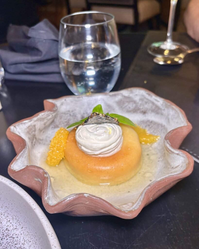 El cierre dulce llegó con 2 de las 6 opciones de postres de la carta: el BABÁ AL RUM, acompañado de chantilly y naranjas ($9.900), liviano y aromático,