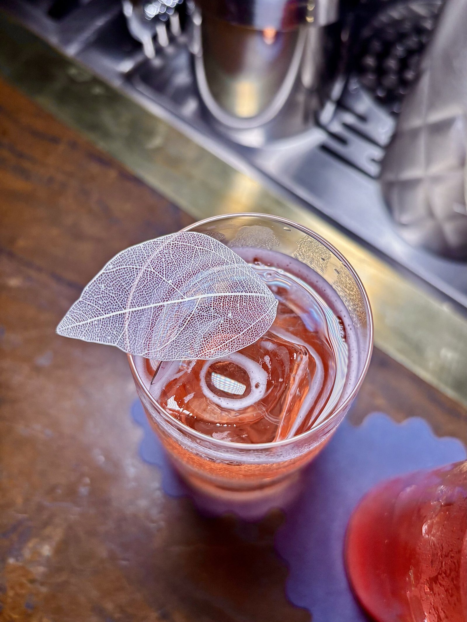 Otro de los que apunta a rotación alta. Bajo en alcohol, con perfil aperitivo y un trabajo interesante desde el gin especiado que suma complejidad, sin romper la lógica del spritz. Con hermosa hojita de decoración, no comestible.
