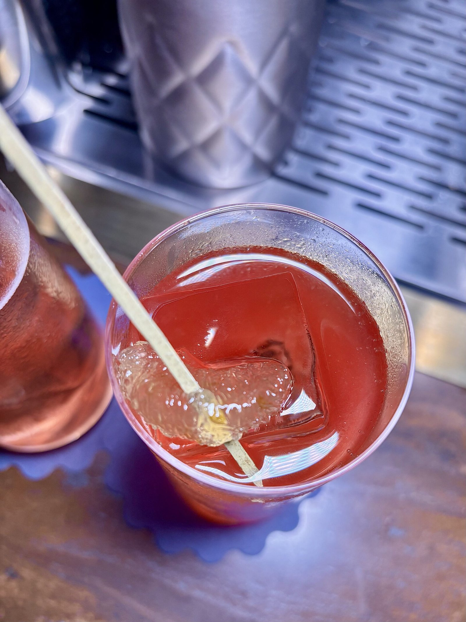 Tequila silver cocinado con pieles de cítricos e hibisco, Cynar, marrasquino, soda