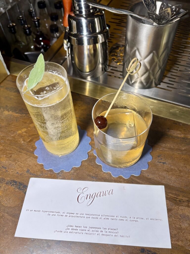 Más que un cóctel, Engawa es un concepto. El nombre remite a ese espacio tradicional japonés de transición —una galería que no está ni completamente dentro ni fuera de la casa— desde donde se contempla el jardín, el entorno, el tiempo. Esa idea de pausa y observación se traduce en el vaso. La construcción es bien simple, pero ahí está la clave. “Tan simple y tan rico como eso”, explicó Guillermina. Un cóctel liviano, de bajo volumen alcohólico, donde las proporciones están ajustadas para que ningún elemento sobresalga y todo funcione en equilibrio.