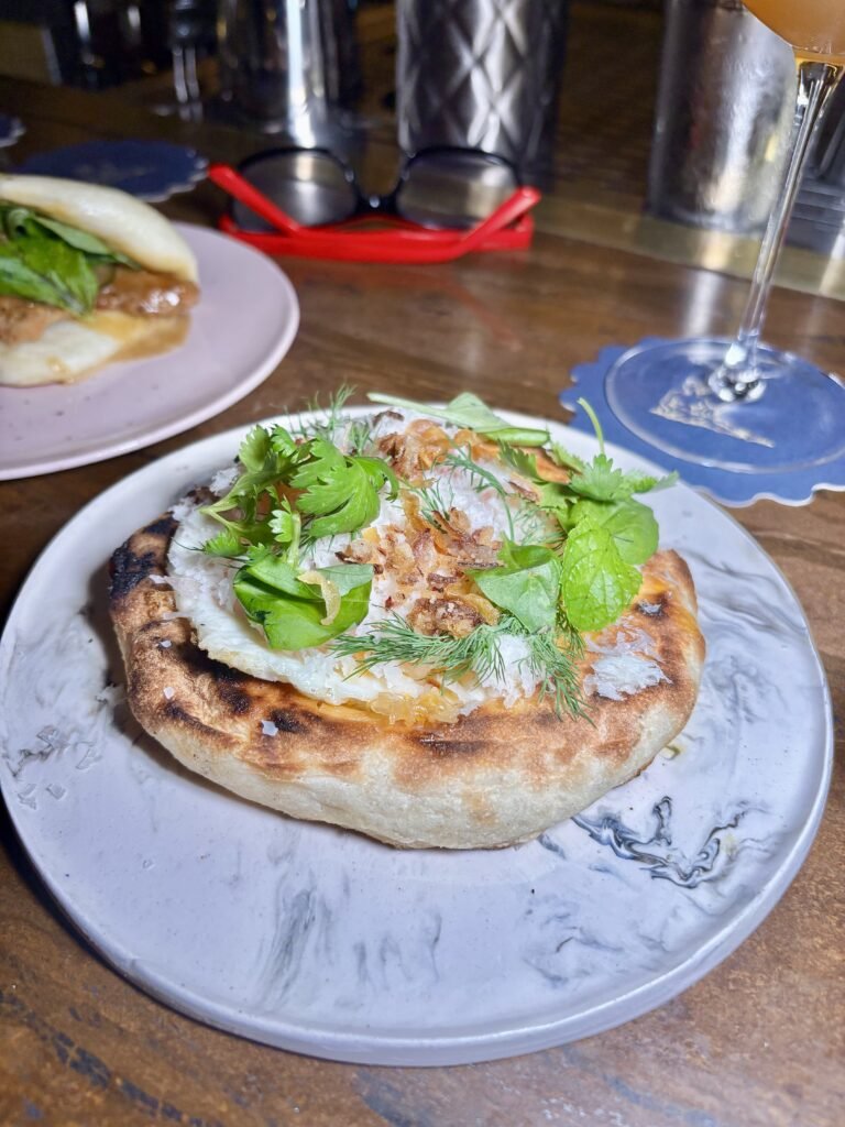 Huevo frito, labneh, pickles de cebolla, hierbas frescas, queso de cabra ($14.500)