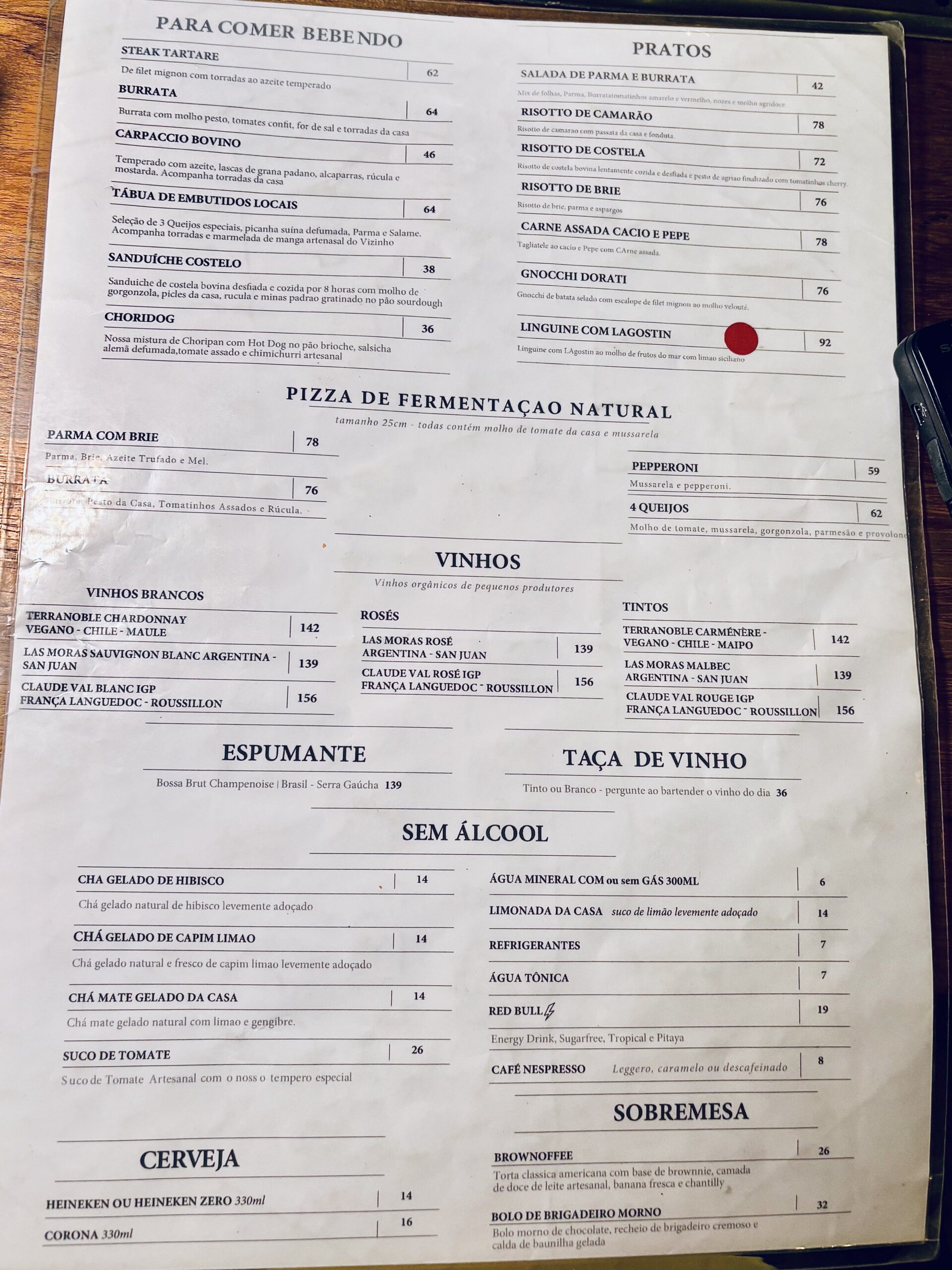 La carta de comidas en físico (porque el QR tenía diferencias) se dividía entre: “Para Comer bebendo” (6 Entradas típicas); Partos (7 Principales); Pizza de Fermentación natural (4); y Postres (2).
