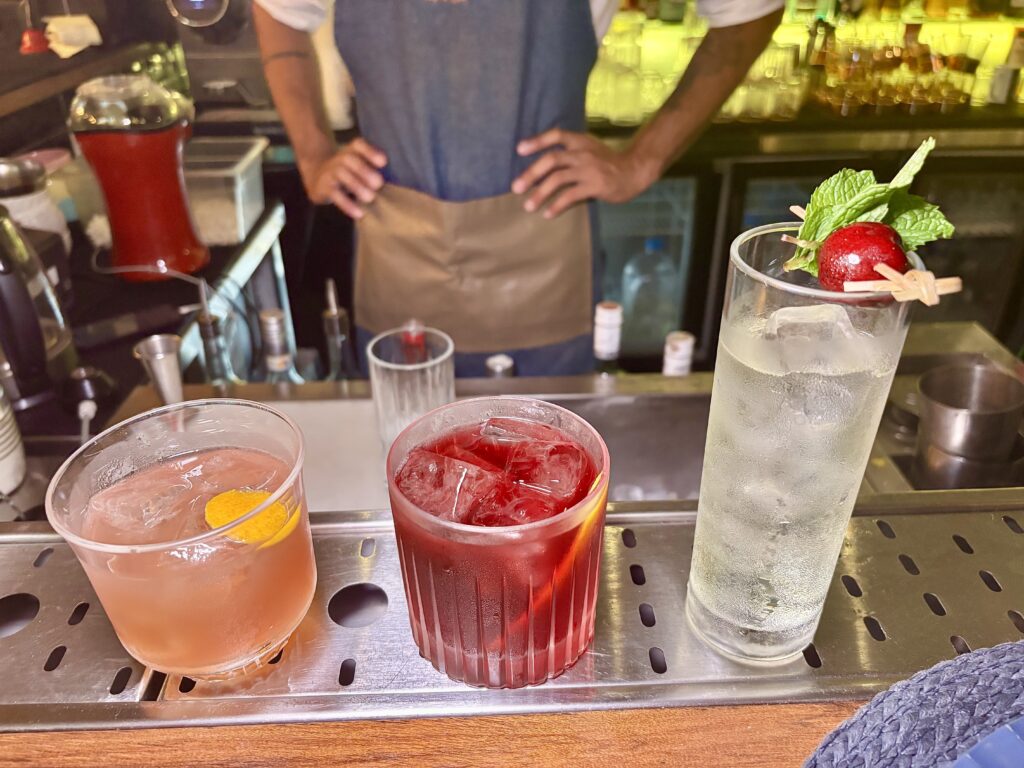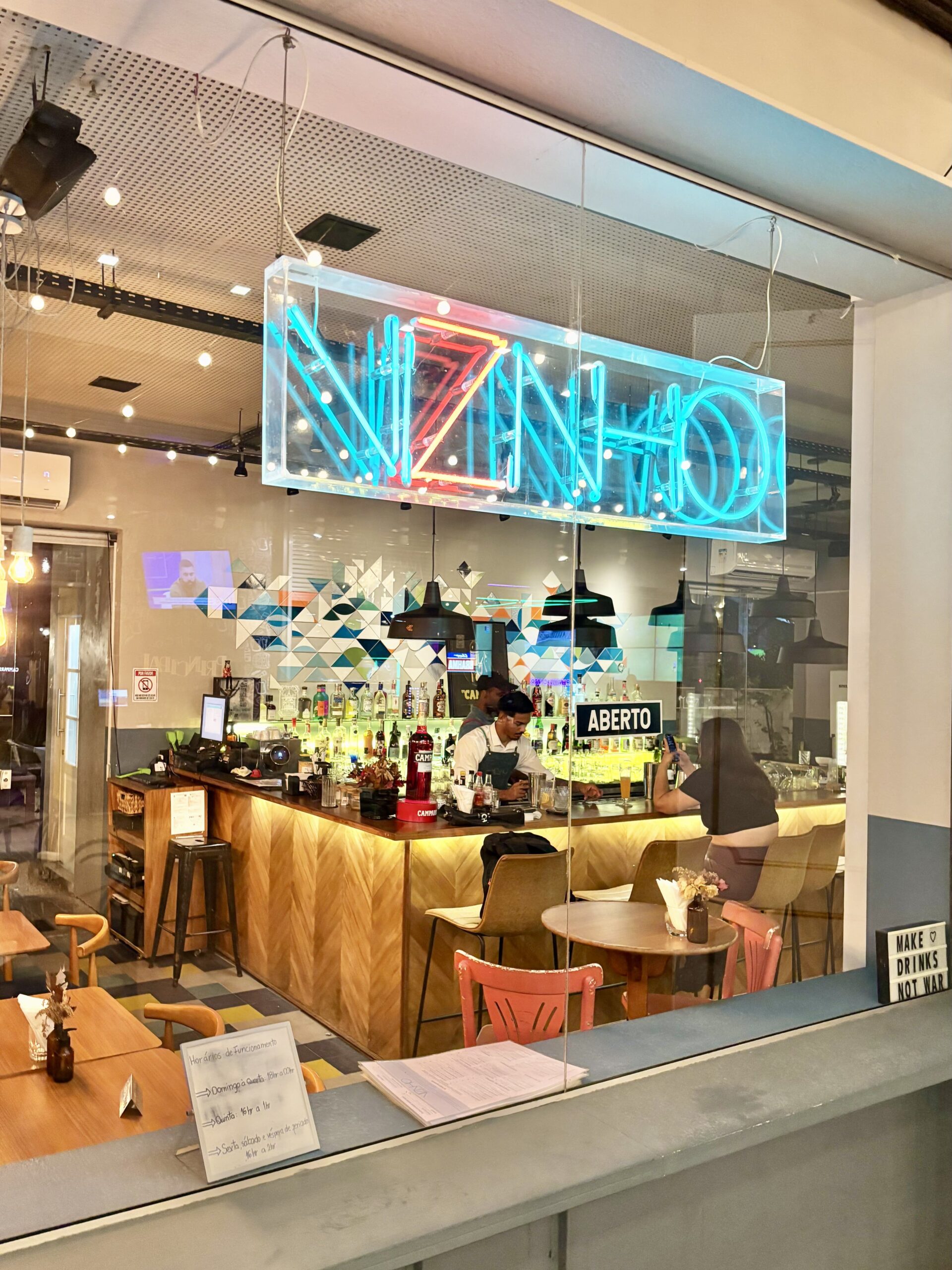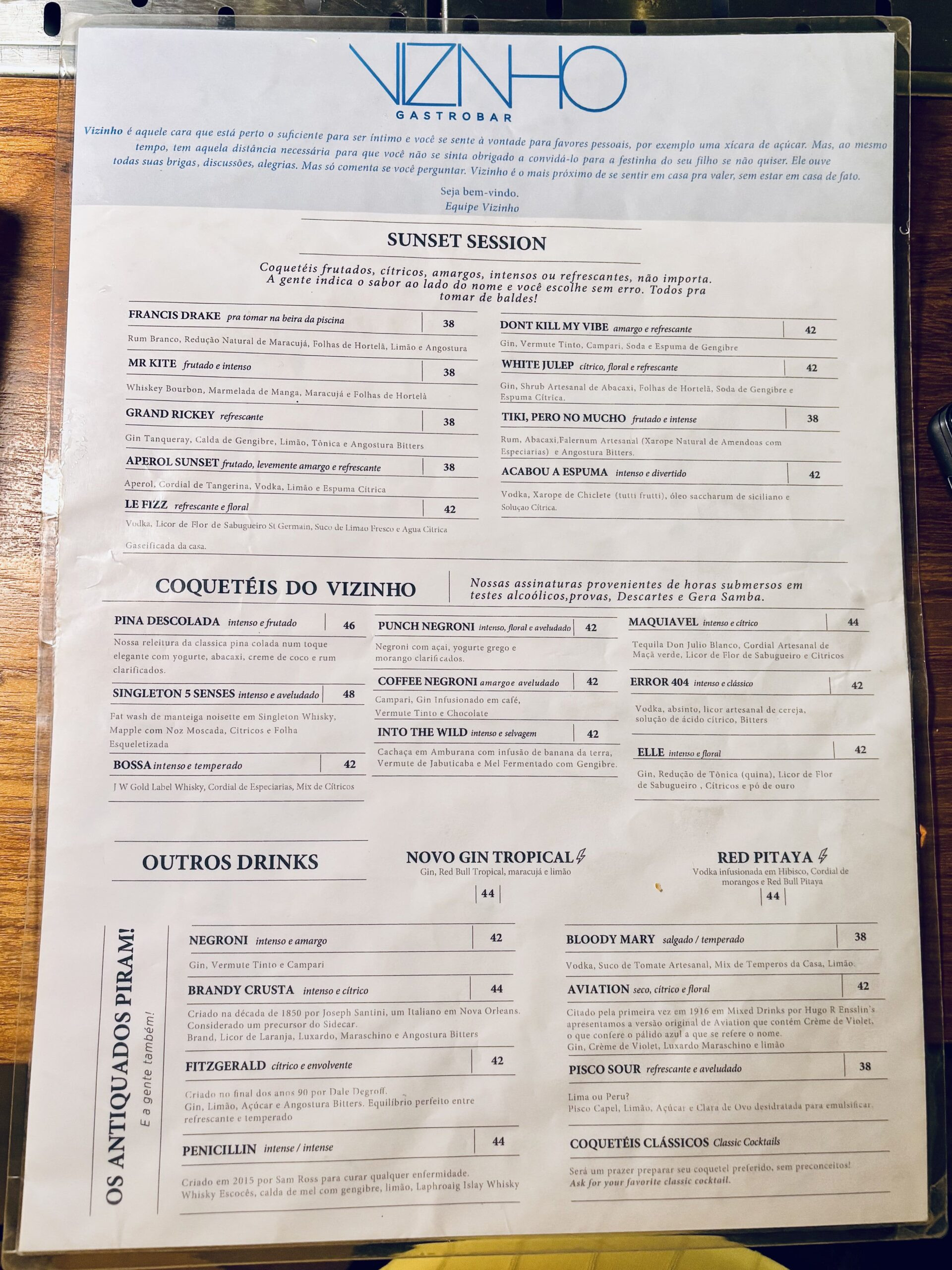 La carta que hizo está sectorizada en: SUNSET SESSIONS (9, más refrescantes, para comenzar), COQUETEIS DO VIZINHO (9, más estructura e intensidad), Outros Drinks (2), y OS ANTIQUADOS PIRAM! (7, “los antiguos se vuelven locos!”).