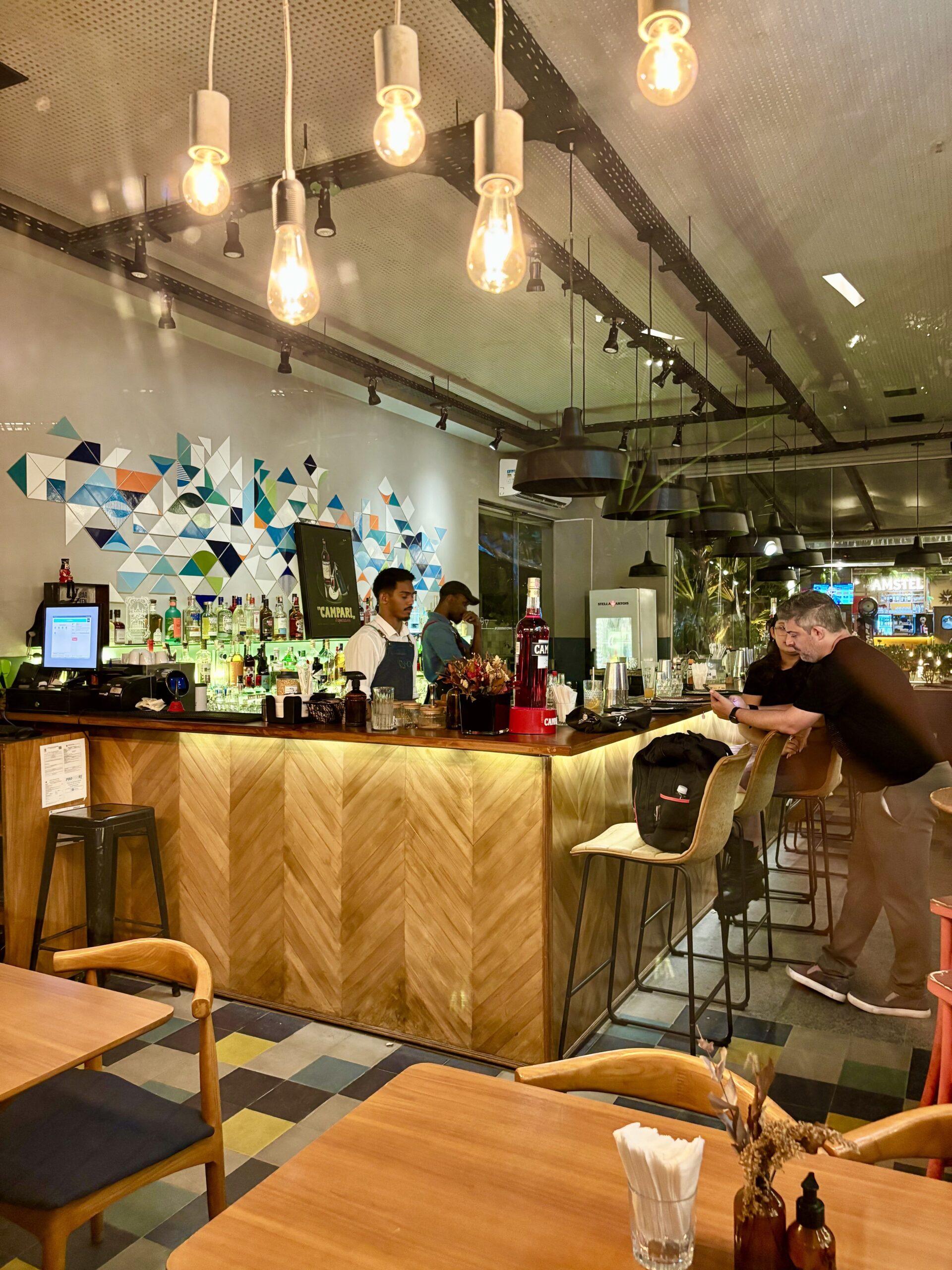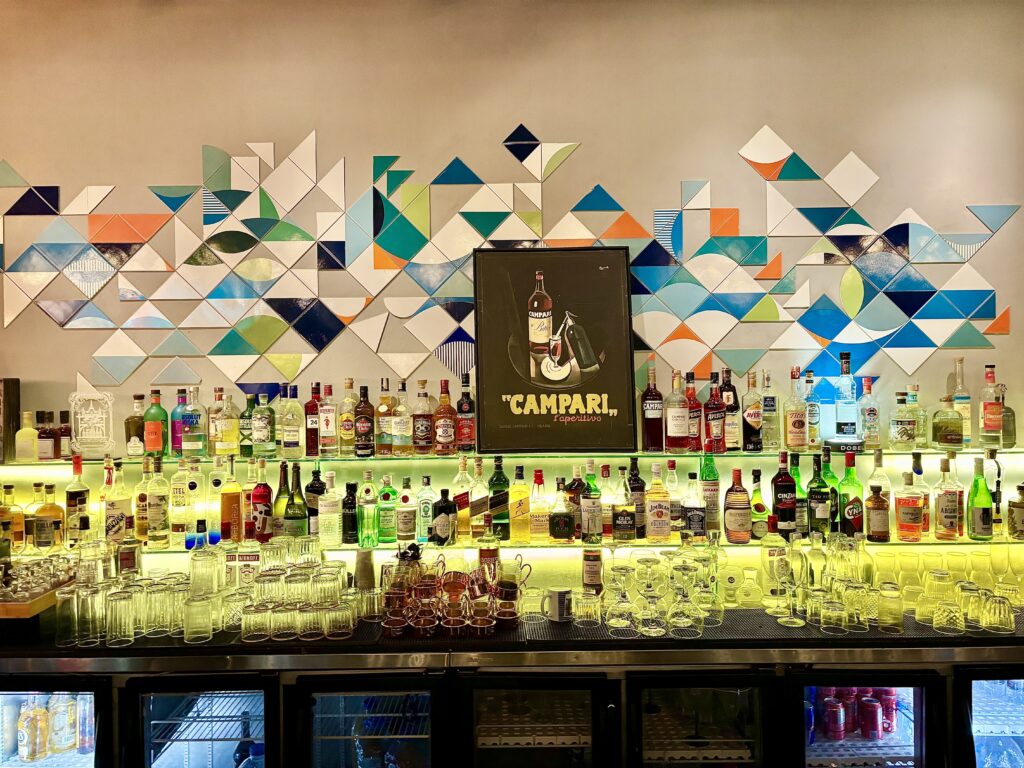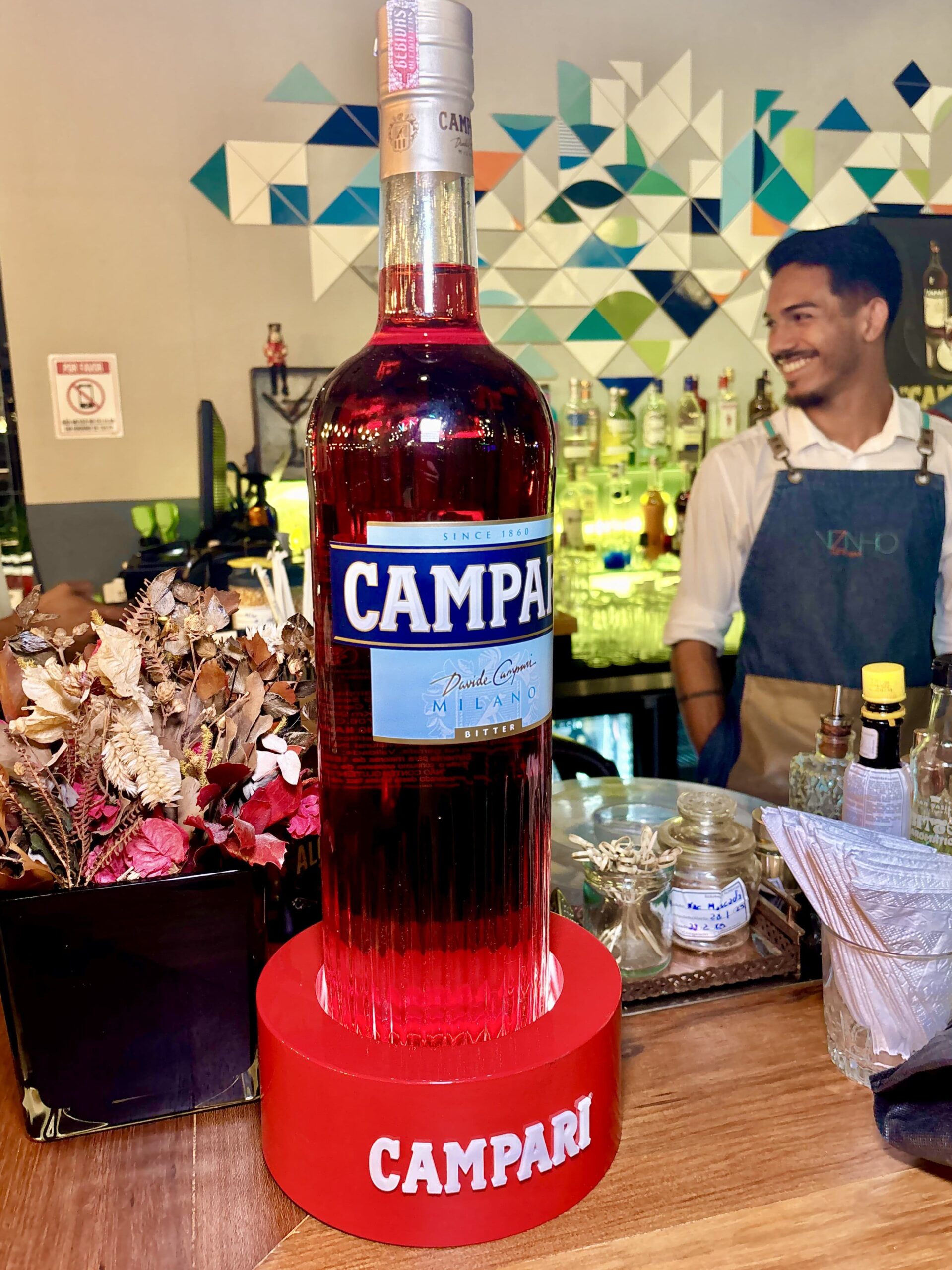 En todo el bar no sorprende la gran visibilidad de CAMPARI, la marca de bebidas que más presencia vimos en las giras de bares por RIO, con varios soportes aportando a la estética de lugares con botellones de 6 lts., cuadros, neones, cojines para sofás, etc.