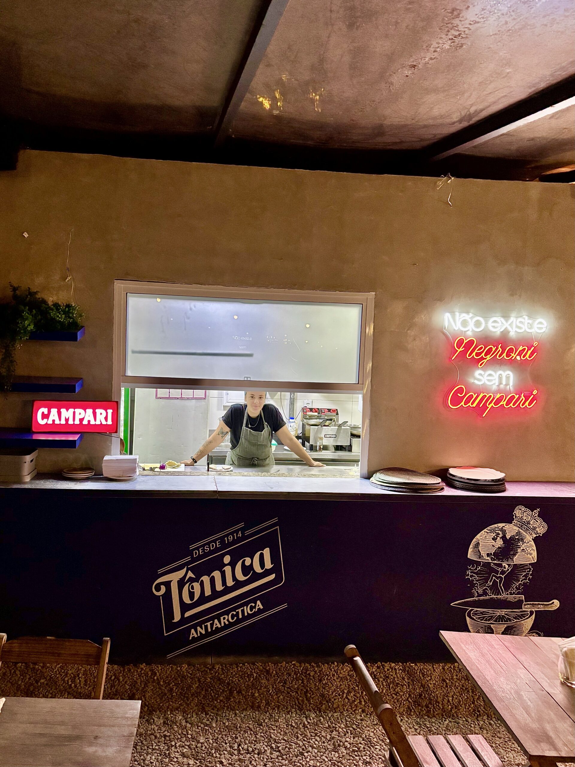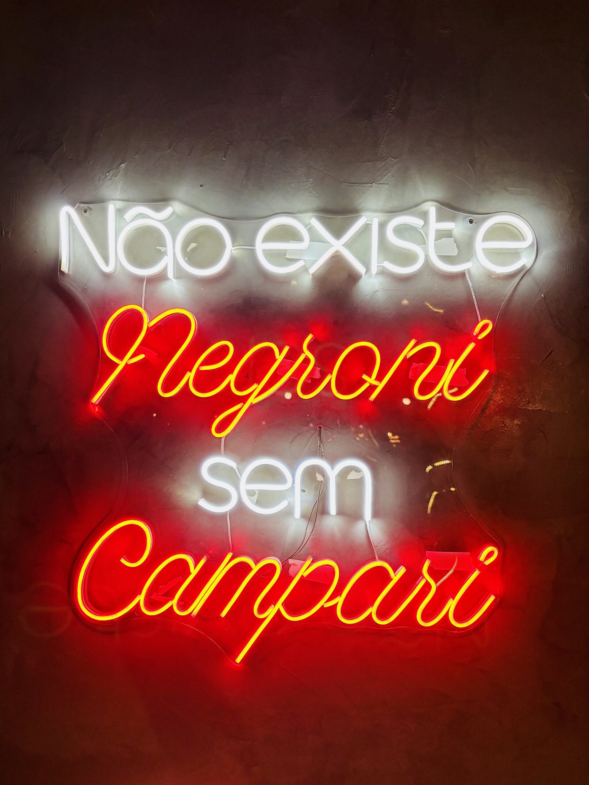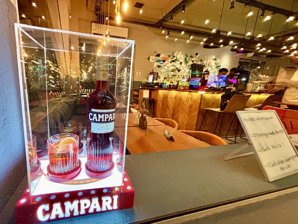 Las 3 opciones de Negronis de autor nos encantaron! Algo esperable viendo a Campari tan fuerte aquí, con un hermoso neón rojiblanco: Não existe Negroni sem Campari”.