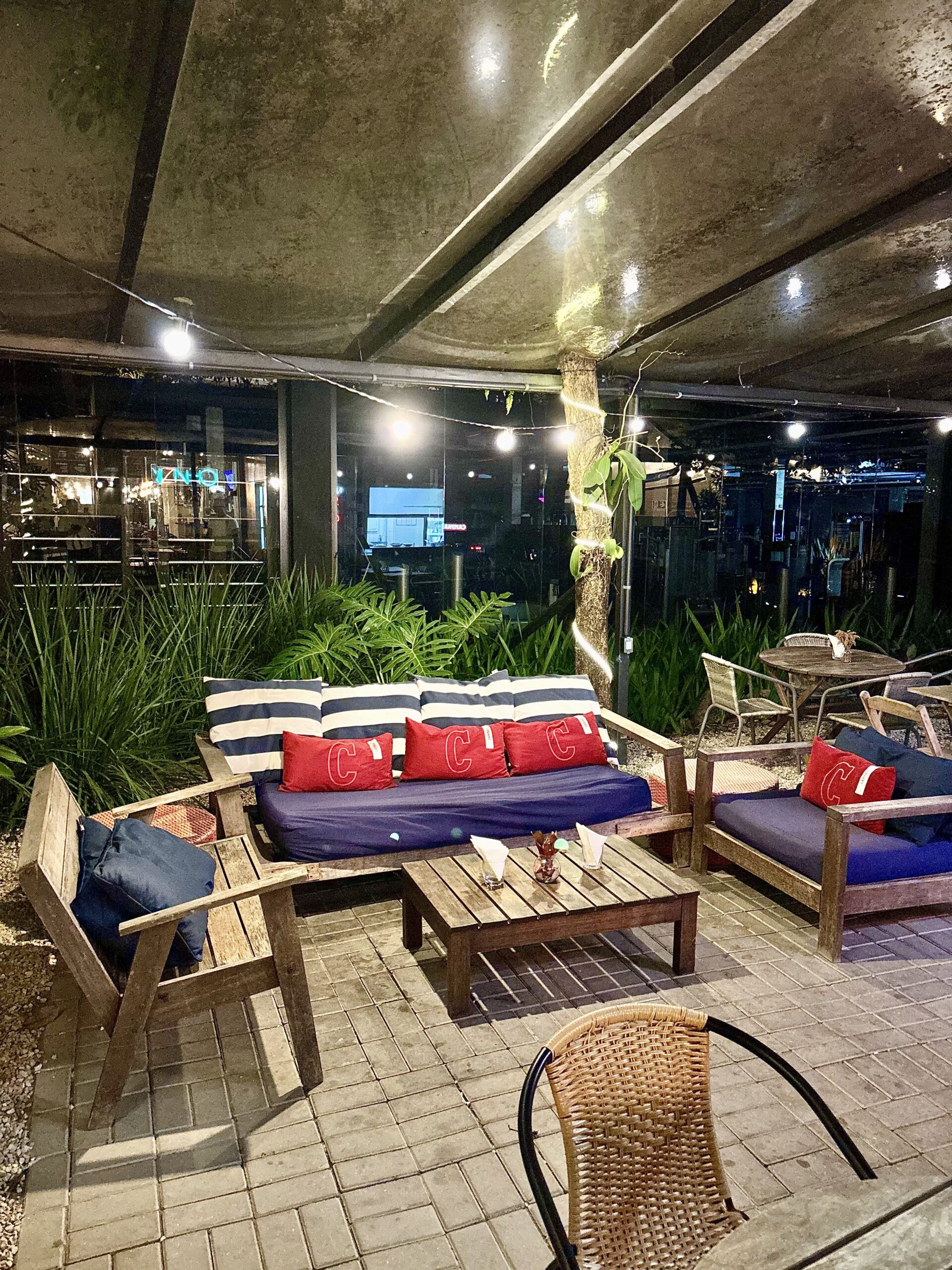 El local es como una casita rectangular al aire libre, con ventanales amplios que permiten ver una barra grande para el espacio. Detrás del local, un jardín semicubierto parece de una casa, y es usado para eventos de hasta 150 personas.