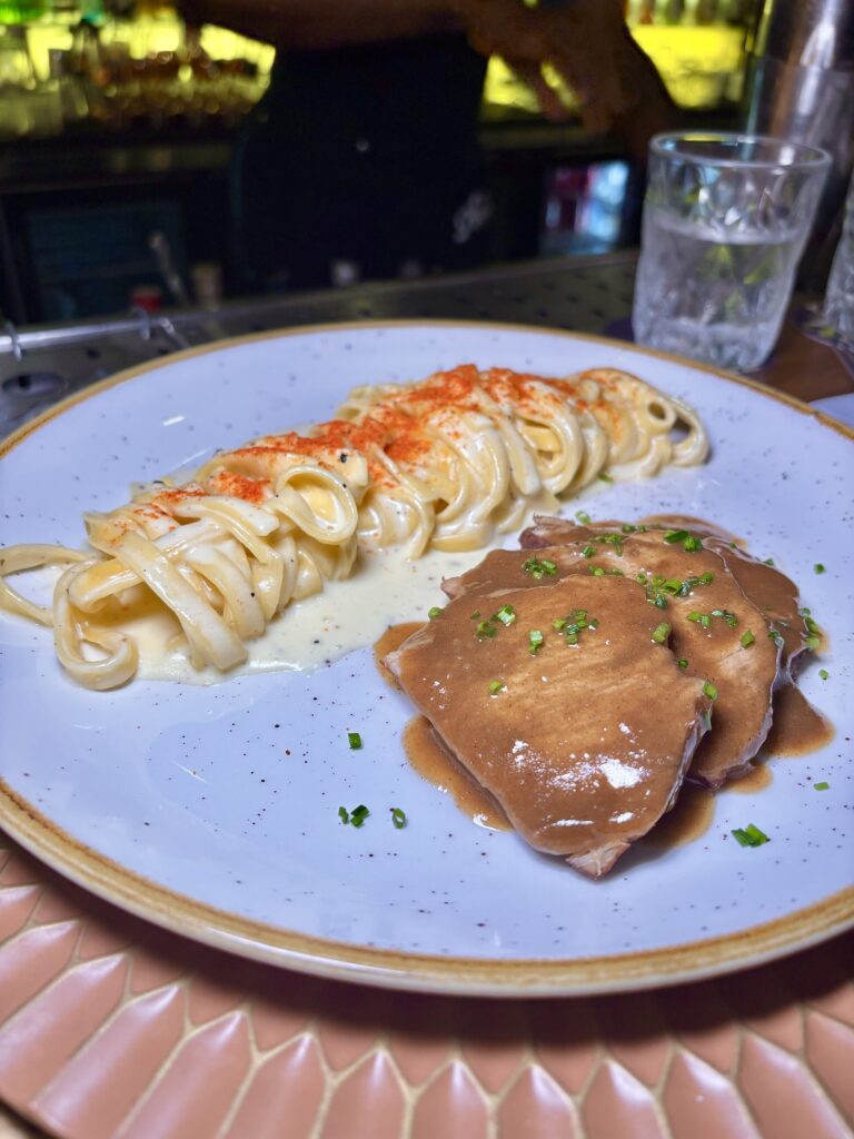CARNE ASSADA CACIO E PEPE, con fideos Tagliatele al queso y pimienta negra (78 R$);