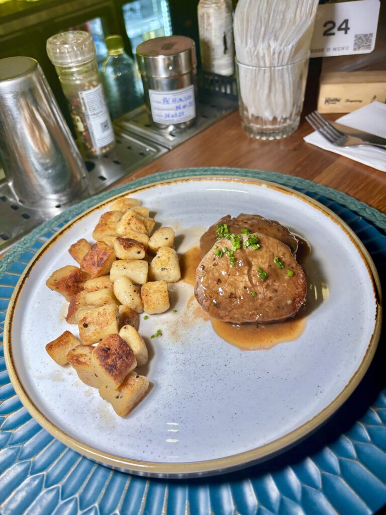 GNOCCHI DORATI, ñoquis de batata con escalope de filet mignon (76 R$), también servidos en el menú ejecutivo (109 R$- 20u$s, con entrada y café).